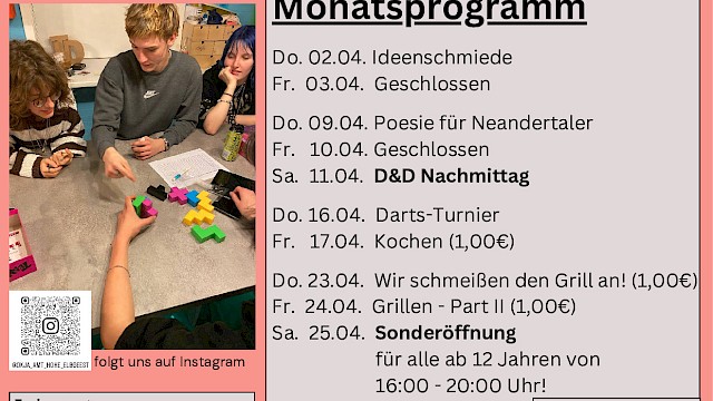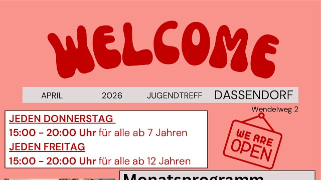 anbei unser >>>Monatsprogramm April für den Jugendtreff in Dassendorf.