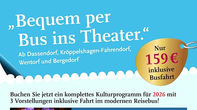 Zusammen mit Gleichgesinnten Theater live erleben und mit unserem Bus-Service zum unbeschwerten Vergnügen fahren, bequem und gesellig direkt zum Theater und wieder zurück. Runter vom Sofa – ab ins Theater! Folgende drei Veranstaltungen erwarten Sie: 25.02.: "Das Gesicht" (Komödie von Siegfried Lenz), Altonaer Theater. 31.03.: "Jungs vun de Waterkant", Ohnsorg Theater. 24.04.: "Stefan Jürgens - Liebe!", Alma Hoppes Lustspielhaus. Leitung: Susanne Nowacki, Gebühr: 159 €.