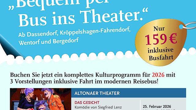 Zusammen mit Gleichgesinnten Theater live erleben und mit unserem Bus-Service zum unbeschwerten Vergnügen fahren, bequem und gesellig direkt zum Theater und wieder zurück. Runter vom Sofa – ab ins Theater! Folgende drei Veranstaltungen erwarten Sie: 25.02.: "Das Gesicht" (Komödie von Siegfried Lenz), Altonaer Theater. 31.03.: "Jungs vun de Waterkant", Ohnsorg Theater. 24.04.: "Stefan Jürgens - Liebe!", Alma Hoppes Lustspielhaus. Leitung: Susanne Nowacki, Gebühr: 159 €.