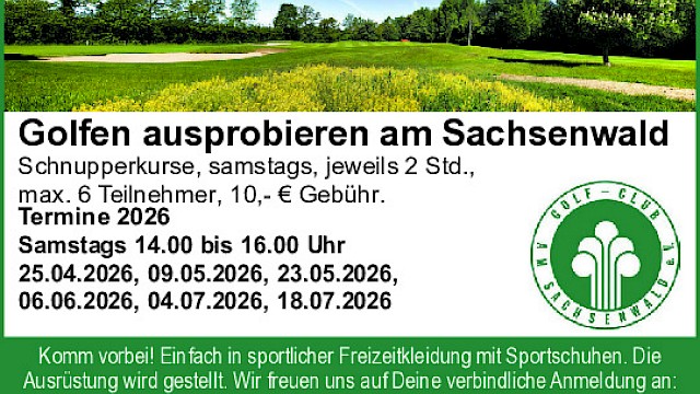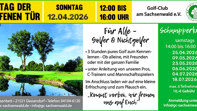 Am Sonntag, den 12.04.2026 von 12.00 Uhr - 16.00 Uhr haben Sie die Möglichkeit, den Golfclub Sachsenwald in Dassendorf kennenzulernen. Für alle Golfer und Nichtgolfer bietet sich die Möglichkeit unter Anleitung von Pros, C-Trainern und Mannschaftsspielern 3 Stunden pures Golf zu Erleben. Ob alleine, mit Feunden oder mit der ganzen Familie. Im Anschluss läder der Golfclub auf eine kleine Erfrischung und zum Plausch ein.